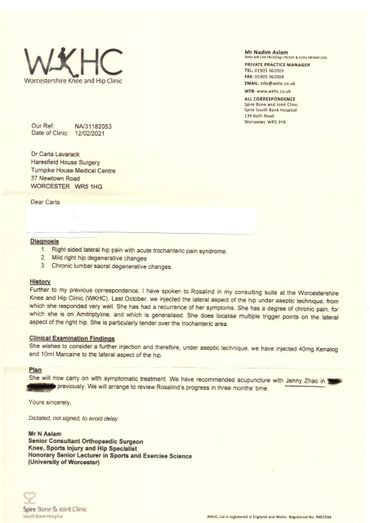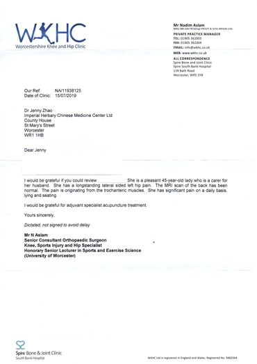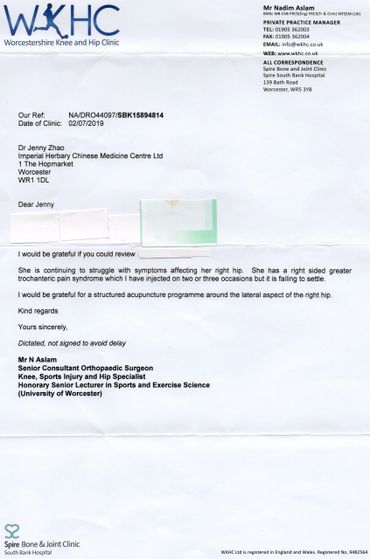 Dr. Nadim Aslam from Spire South Bank Hospital "I would be grateful if you can review Mrs. Brown's case. She is continuing to struggle with symptoms affecting her right hip. I would be grateful for a structured acupuncture programme around the lateral aspect of the right hip."
