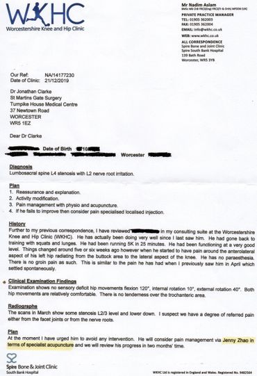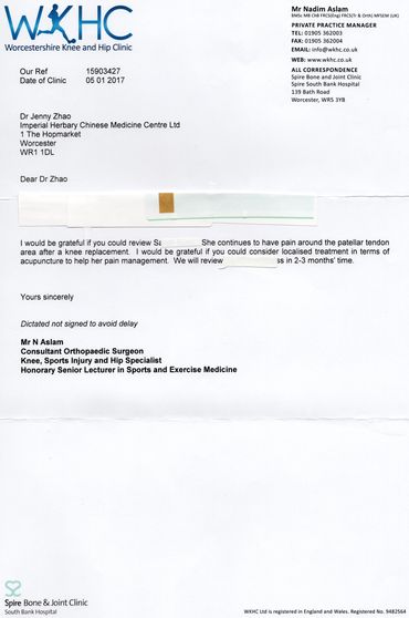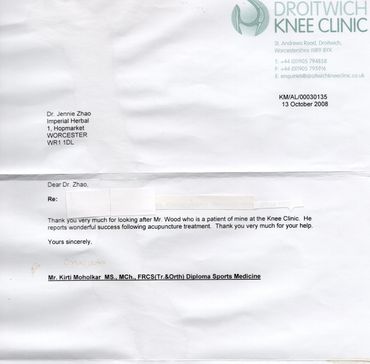 Dr. Kirti Moholkar from Droitwich Knee Clinic "Thank you very much for looking after Mr. Wood who is a patient of mine at the Knee Clinic. He reports wonderful success following acupuncture treatment. Thank you very much for your help."